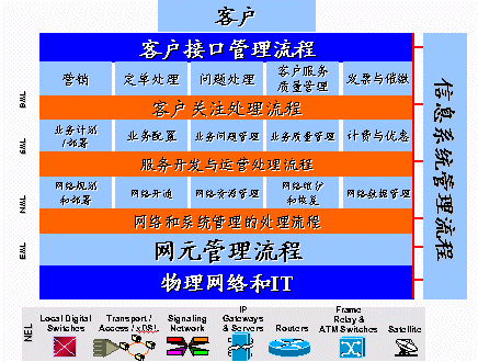 Assurance)的定義是,提供量化的測量指標,確保網(wǎng)絡(luò)服務(wù)能夠達到客戶所訂購的要求。(Service Usage)的定義是,測量電信網(wǎng)絡(luò)中各種業(yè)務(wù)的使用情況,計算處理使用電信業(yè)務(wù)的應(yīng)收費用,并對電信業(yè)務(wù)的收費過程提供支持。這是從縱向的角度來看,而從橫向的角度來看,從電信管理的角度來看,OSS主要處在三個管理層面:客戶服務(wù)層;業(yè)務(wù)管理層;網(wǎng)絡(luò)管理層。