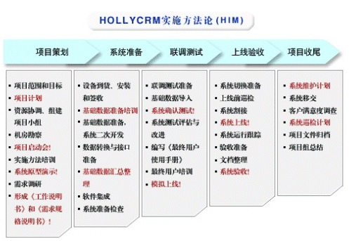 HOLLYCRM(合力金橋軟件)公司是國(guó)內(nèi)最早從事呼叫中心應(yīng)用軟件開(kāi)發(fā)與服務(wù)公司,在多年的實(shí)踐經(jīng)驗(yàn)基礎(chǔ)上形成了完整的“456”呼叫中心“項(xiàng)目實(shí)施方法論”(HIM:HOLLYCRM Implementary Methodology),即“四大實(shí)施策略、五個(gè)項(xiàng)目階段、六大管理專題”。該體系的有效運(yùn)行對(duì)公司項(xiàng)目的成功上線和推進(jìn)軟件產(chǎn)品的成熟將起到至關(guān)重要的作用。