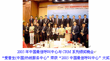 EPSON(中國)客服系統(tǒng)榮獲了"2005中國最佳呼叫中心"大獎(jiǎng)。 由信息產(chǎn)業(yè)部中國信息化推進(jìn)聯(lián)盟客戶關(guān)系管理專業(yè)委員會、CTI論壇客戶關(guān)系管理學(xué)院共同舉辦的2005
