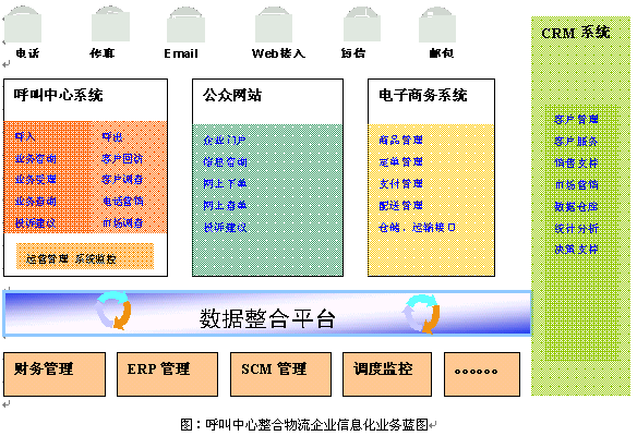 為解決傳統(tǒng)物流企業(yè)"成本高"、"效率低"的瓶頸問題,物流行業(yè)信息化目前已經(jīng)超越了關(guān)注和觀望,第一層次的信息化平臺(tái)在很多企業(yè)已經(jīng)實(shí)施,如內(nèi)部的財(cái)務(wù)管理、倉儲(chǔ)管理、定單管理、運(yùn)輸管理等,相關(guān)系統(tǒng)包括ERP、物流管理(LM)、SCM等應(yīng)用系統(tǒng)。更進(jìn)一步,針對物流企業(yè)核心是提供"服務(wù)"這個(gè)概念,呼叫中心、電子商物、以及CRM技術(shù)的結(jié)合將對物流基礎(chǔ)信息平臺(tái)起到至關(guān)重要的整合作用: