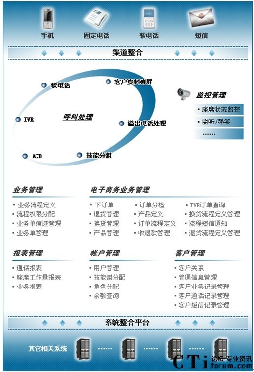 - 全面電子商務(wù)業(yè)務(wù)管理模塊,實現(xiàn)呼叫中心與業(yè)務(wù)的完美結(jié)合;