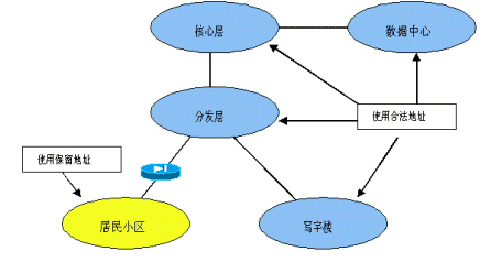 考慮IP地址資源有限,因此,居民小區(qū)接入用戶量大,地址使用效率低,因此在居民小區(qū)部分采用RFC 1519規(guī)定的保留地址,建議采用10.0.0.0。在每個小區(qū)的出口處配備地址轉(zhuǎn)換設(shè)備,實(shí)現(xiàn)保留地址和合法地址之間的轉(zhuǎn)換。