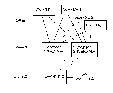 硬件平臺呈3層結(jié)構(gòu),分別為應(yīng)用層、Infranet計費(fèi)和用戶管理層以及數(shù)據(jù)庫層。