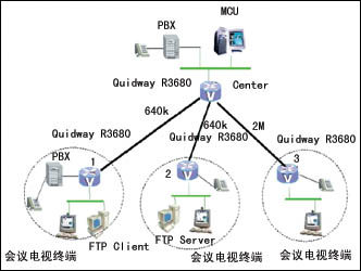 對(duì)于視頻的互通,則采用專用的視頻網(wǎng)關(guān),在中心處配置一臺(tái)MCU作為整個(gè)網(wǎng)絡(luò)視頻系統(tǒng)的管理者,1、2、3節(jié)點(diǎn)則配置具有視頻網(wǎng)關(guān)功能的視頻終端。在網(wǎng)上召開視頻會(huì)議時(shí),各會(huì)場(chǎng)的加入和畫面的調(diào)度都由位于中心的MCU進(jìn)行控制。通過視頻網(wǎng)關(guān)壓縮的圖像的帶寬為512kbps。