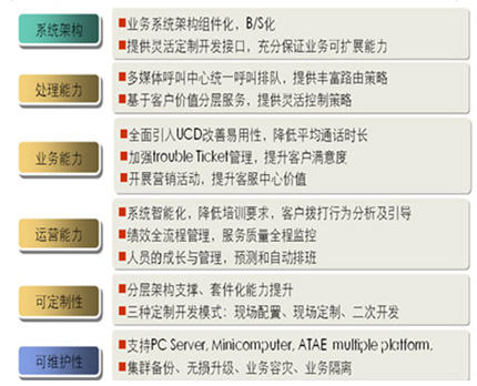 從服務(wù)內(nèi)容來看,聯(lián)絡(luò)中心建立了一個統(tǒng)一面向客戶的綜合性服務(wù)平臺,實(shí)現(xiàn)涵蓋公司各項(xiàng)主要產(chǎn)品和業(yè)務(wù)的專業(yè)信息咨詢與交易功能,并實(shí)現(xiàn)人工服務(wù)、業(yè)務(wù)咨詢、業(yè)務(wù)處理、投訴處理、建議受理、預(yù)約服務(wù)、客戶回訪等一體化的話務(wù)處理與管理,為客戶提供多樣化、全方位、個性化的接入方式與服務(wù)內(nèi)容。