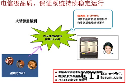 華為聯絡中心系統(tǒng)具有高穩(wěn)定性、高可靠性、易擴展性和可維護性。這主要源于華為對電信網絡現狀與演進的理解,源于華為擁有固定、移動和IP三個網絡方面綜合實力。華為數以千計的核心平臺開發(fā)測試人員,幾十種極端環(huán)境(如超大話務量、溫差、濕度、鹽堿度、缺氧等),磨礪出的是世界級的高品質。麥加朝圣10KM內密集200萬移動用戶,大部分為國際漫游,整齊劃一的用戶行為,形成連日多波話務尖峰,網絡受不均衡沖擊,系統(tǒng)容易雪崩。使用華為方案STC連續(xù)四年征服HAJJ期間話務高峰,告別系統(tǒng)每逢朝圣就癱瘓歷史。正是繼承了這樣的DNA,我們在某移動運營商聯絡中心系統(tǒng)單點實測BHCC1200K,每天平均呼叫量為600萬次,一套系統(tǒng)支撐著2000多座席和近8000路IVR。