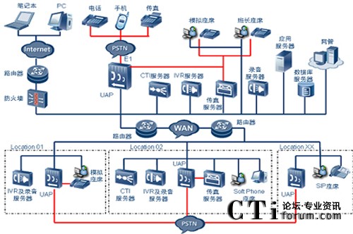 華為多媒體聯絡中心提供完善的分布式組網及集中式組網功能,可以提供分布式接入、分布式IVR、分布式錄音系統(tǒng)、分布式坐席、分布式傳真系統(tǒng)及網絡呼叫中心技術。如果各個分支機構有較多本地化業(yè)務需求的時候,各個分支機構只需要再配置一臺CTI服務器,就可以升級成完整的聯絡中心系統(tǒng),可以單獨開展豐富的個性化業(yè)務。如果總部再安裝一套網絡呼叫中心,則可以實現聯絡中心的互連,即網絡呼叫中心。