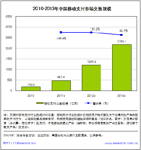 艾瑞咨詢近期推出《2011年中國移動(dòng)支付行業(yè)研究報(bào)告》,針對中國移動(dòng)支付市場現(xiàn)狀進(jìn)行了深入的探討。報(bào)告研究數(shù)據(jù)顯示,2011年中國移動(dòng)支付市場交易規(guī)模將達(dá)到481.4億元,同比增長149.4%。以下截取報(bào)告觀點(diǎn)進(jìn)行詳細(xì)解讀: