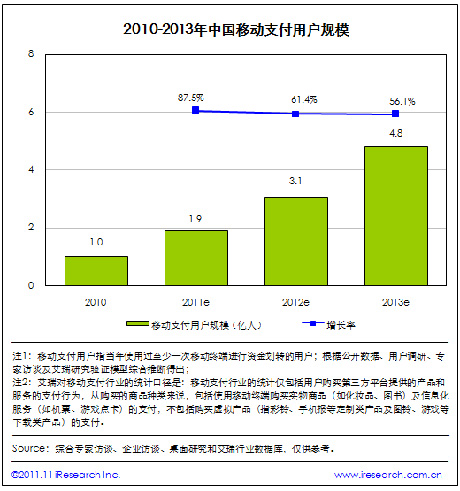 根據(jù)艾瑞咨詢統(tǒng)計(jì)數(shù)據(jù),2011年中國移動(dòng)支付用戶規(guī)模將達(dá)到1.9億。艾瑞預(yù)計(jì),2013年中國移動(dòng)支付用戶規(guī)模將達(dá)到4.8億。移動(dòng)網(wǎng)上支付用戶規(guī)模的增長帶動(dòng)了整個(gè)行業(yè)用戶規(guī)模的爆發(fā),另外手機(jī)短信支付也在用戶群體中得到了進(jìn)一步的普及。