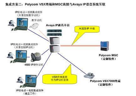 方式二:Polycom VSX系列終端和MGC直接和Avaya IP語(yǔ)音系統(tǒng)集成。
