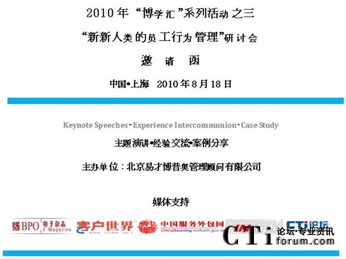 21世紀(jì)什么是貴?人才最貴!人才是企業(yè)持續(xù)發(fā)展的唯一生命之源。易才博普奧公司(CTG BPO)作為專業(yè)的人力資源外包專家、服務(wù)外包產(chǎn)業(yè)專業(yè)人才租賃供應(yīng)商,近年來在業(yè)界積累了大量優(yōu)秀的一線人才租賃經(jīng)驗并得到廣泛的業(yè)界好評!2010年伊始,易才博普奧推出了“博學(xué)匯”系列客戶交流會活動,旨在搭建一個與行業(yè)精英、業(yè)內(nèi)專家互動交流的平臺,學(xué)習(xí)、體驗和分享多元文化,促進和推動彼此之間的交流與合作。