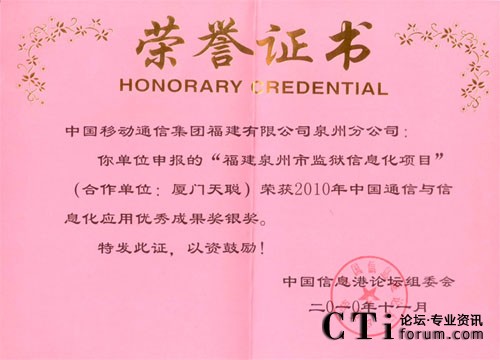 5.榮獲“2010年中國通信與信息化應(yīng)用優(yōu)秀成果獎”銀獎。
