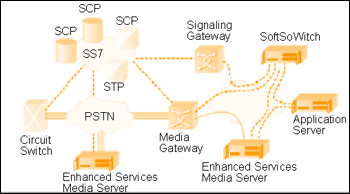 在PSTN網(wǎng),交換機(jī)組、SCP(Service Connection Points)和媒體服務(wù)器協(xié)同工作,為用戶提供服務(wù)。在包交換網(wǎng)絡(luò)環(huán)境,這種服務(wù)由軟件交換機(jī)(Softswiches)、媒體服務(wù)器和應(yīng)用服務(wù)器協(xié)同提供。連接這兩種網(wǎng)絡(luò)的橋梁是媒體網(wǎng)關(guān)和信令網(wǎng)關(guān)。值得注意的是,包交換中的部件都是邏輯點,其多個部件可能僅僅由網(wǎng)絡(luò)中的一個應(yīng)用硬件平臺提供。例如:一個基于網(wǎng)絡(luò)提供語音識別功能的語音郵件系統(tǒng)可能包括如下模塊: