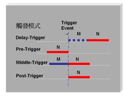 、中間觸發(fā)(middle-trigger)及后觸發(fā)(post-trigger)。其觸發(fā)點(diǎn)與所采集到數(shù)據(jù)的關(guān)系如下圖所示: