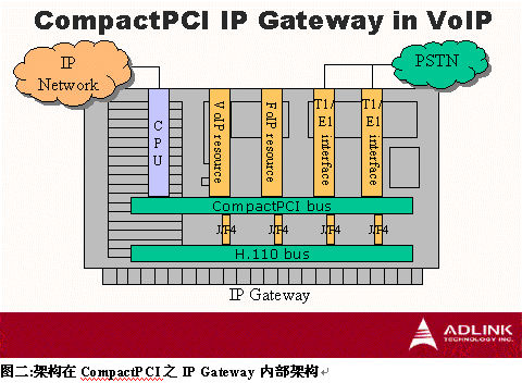 如何實現(xiàn)如此多功能的IP Gateway如圖二架構(gòu),在CompactPCI標(biāo)準(zhǔn)的背板上,整合了計算機電話領(lǐng)域常用的標(biāo)準(zhǔn)H.110 bus,提供冗余時鐘支持熱插拔板卡如VoIP、FoIP、T1/E1