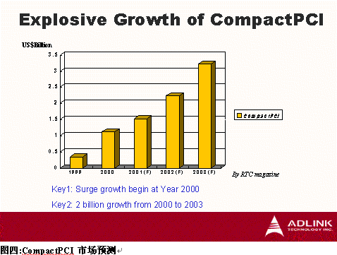 Magazine 估計,CompactPCI市場將由1999年的美金$350 Million成長到2003年的美金$3200 Million,年復(fù)合成長率高達45.6%,其中又以2002年至2003年最大幅成長。CompactPCI為工業(yè)計算機產(chǎn)業(yè)開拓了一個以往傳統(tǒng)工業(yè)計算機無法應(yīng)用的新市場,而CompactPCI需針對電信等級應(yīng)用提供高可靠度及達到嚴(yán)苛高品質(zhì)要求,卻又為傳統(tǒng)工業(yè)計算機廠商豎立高進入障礙,因此,目前能提供電信級CompactPCI寬頻通訊平臺幾為國外廠商,如Motorola、Ziatech、Force