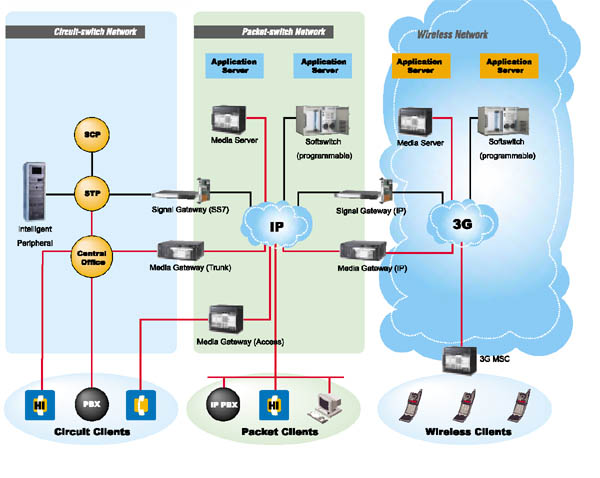 在下一帶網(wǎng)絡(NGN)中媒體網(wǎng)關在軟交換(softswitch)的控制下,將一種網(wǎng)絡中的媒體轉(zhuǎn)換成另一種網(wǎng)絡所要求的媒體格式。如媒體網(wǎng)關能夠在電路交換網(wǎng)的承載通道和分組網(wǎng)的媒體流之間進行轉(zhuǎn)換,可以處理音頻、視頻或T.120,也具備處理這三者任意組合的能力,并且能夠進行全雙工的媒體翻譯,可以演示視頻/音頻消息,實現(xiàn)其他IVR功能,同時還可以進行媒體會議等。