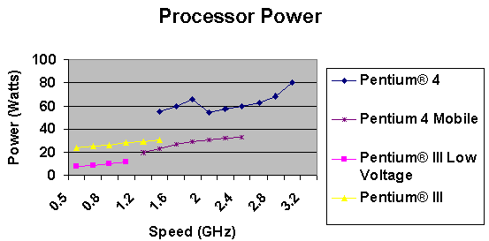 一個32W的功率讓一顆Pentium 4的處理器可以跑到1.7GHz,要增加處理器的速度則讓我們必須增加散熱片的大小,或是降低最大操作溫度、增強吹風,或者是這些方法中的某種組合。下一代的設計目標會是達到3GHz的P4處理器,那表示我們必須要能處理65W的熱能。下一代的卡板由于將具備更加多樣豐富的功能與規(guī)格,勢必難以在增加散熱片大小上做文章,多出來的33W將必須通過增加風速和降低最大操作溫度來達成。每分鐘450英尺的風速,散熱片熱阻0.45°C/W,周邊操作溫度可被降到40°C。如果給定這樣的條件,處理器最大的功率將是