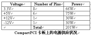 CompactPCI卡板透過J1/J2的連接器來接收電源。有8個3.3V、6個5V、1個+12V、1個-12V的電源接腳。這些接腳供應1安培 IEC61076-4-101規(guī)格的電。每個接腳一安培的限制是保守的,而且某種程度上會誤導讓人以為所有的接腳可以在周邊溫度70°C的狀況下去接一安培的電流。在現實狀況中并不是所有連接器中的接腳都負載到最大的電流量,事實上大部分的CompactPCI接腳都是負載在以毫安為單位的電流范圍中。70°C一安培的限制,是基于流過接腳的電流所產生的熱。當電流增加時,也加大了跨過接腳的電位差。產生的熱是一種電壓和電流的函數,電壓和電流的增加會使連接器接腳的溫度上升。在CompactPCI中有最顯著電流量的的接腳,是電源供應器接腳。如果設計者假設J1/J2連接器中的其它所有接腳都有電流負載,每一個接腳的最大電流則會是在40°C 2.5Amps, 這個信息可以在IEC61076-4-101的規(guī)格中的4.2.3中被找到。在每個接腳2.5安培的條件下,板卡可取得的功率大小如下表所示,此表顯示出卡板的設計者最多可以從J1/J2連接器中拉出200Watts的電。