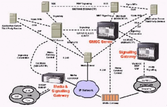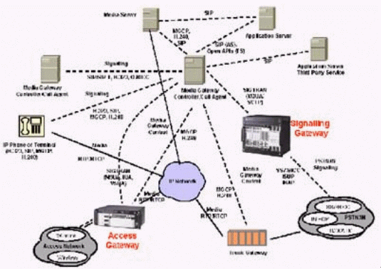 本例中的媒體網(wǎng)關(guān)控制器(MGC)終結(jié)所有的信令,包括直接傳輸?shù)暮屯ㄟ^IP的信令,完成如一個SIP電話向PSTN網(wǎng)絡(luò)發(fā)送信號之類的信令互通,還對打到VoIP網(wǎng)絡(luò)的呼叫進(jìn)行鑒權(quán)和選擇路由,并提供計費信息。這個MGC還通過SIP/SIP-T,H.323或Q.BICC與其他的MGC通信。