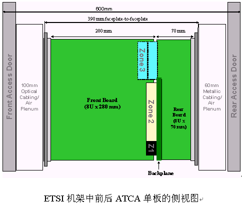 PICMG 3.0機(jī)構(gòu)要求主要來(lái)自于對(duì)600mm ETSI 和19" EIA標(biāo)準(zhǔn)機(jī)柜空間使用的研究。PICMG 3.0委員會(huì)在考慮單板尺寸能支持下一代元器件對(duì)物理和散熱的需求的同時(shí),機(jī)箱空間能和板子能達(dá)到最大限度的配合和利用。最初的工作是基于歐規(guī)卡的標(biāo)準(zhǔn),繼而又提升到支持低成本的片狀金屬架構(gòu)(簡(jiǎn)單電訊封裝)。對(duì)后走線模塊的支持滿足了對(duì)后I/O應(yīng)用的需求。在決定可以使用的單板空間時(shí),也充分考慮了前、后板的進(jìn)深范圍以供大量電纜束綁空間。經(jīng)過對(duì)不同規(guī)格尺寸的單板的優(yōu)點(diǎn)進(jìn)行討論之后,PICMG 3.0組織統(tǒng)一規(guī)格如下:前板 8U x 280mm,進(jìn)深1.2" pitch,選配后板8U x 70mm深;1.2" pitch,19" EIA機(jī)框可以支持14槽,而600mm ETSI的機(jī)框可以支持16槽。下圖所示為600mm ETSI機(jī)架中的ACTA前后單板的側(cè)視圖: