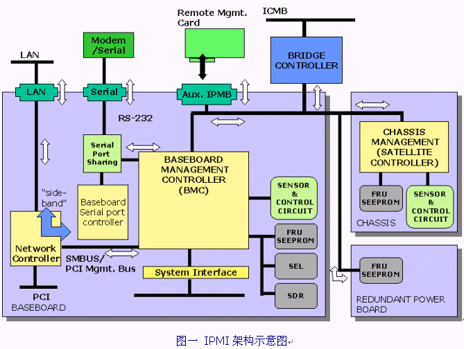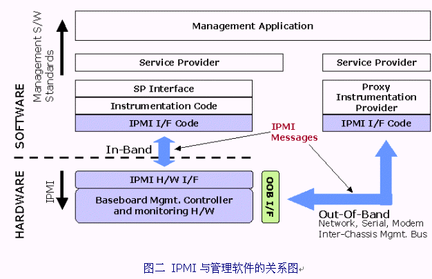 由圖二我們可以看出,IPMI的界面以及上層的管理都需求一些軟件來(lái)支持,以下將簡(jiǎn)略的描述IPMI所涉及到的軟硬件種類: