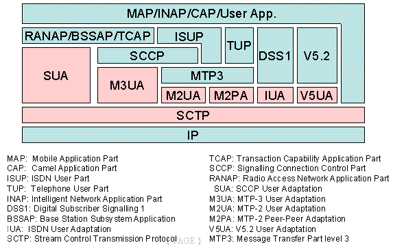 圖中粉紅色部分為SIGTRAN的協(xié)議棧,在它們之上的是對(duì)應(yīng)的電話信令協(xié)議。SIGTRAN的協(xié)議棧分為2層:一層是SCTP,它提供多個(gè)流的,可靠的數(shù)據(jù)傳輸,用戶數(shù)據(jù)的捆綁和分段,阻塞和流量控制,防止"拒絕服務(wù)"和"偽裝"的攻擊等功能。另一層是用戶適配層,圖中由SUA、M3UA、M2UA、M2PA、IUA和V5UA五個(gè)適配模塊所組成,它們分別來滿足各種電話信令協(xié)議適配的要求。