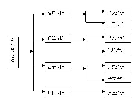 通過(guò)商業(yè)智能可以實(shí)現(xiàn)對(duì)客戶分析、保單分析、業(yè)績(jī)分析和項(xiàng)目分析等各項(xiàng)內(nèi)容進(jìn)行管理分析。它包含5個(gè)決策分析模型以及超過(guò)60種的商業(yè)智能分析報(bào)表,內(nèi)嵌式數(shù)據(jù)挖掘模型與決策分析報(bào)表為電話營(yíng)銷管理人員提供了有力的分析工具,對(duì)于銷售管理起到了定量分析、定性決策的重要支撐作用,支持不同層次的管理者進(jìn)行不同范圍的決策。其系統(tǒng)架構(gòu)圖如下: