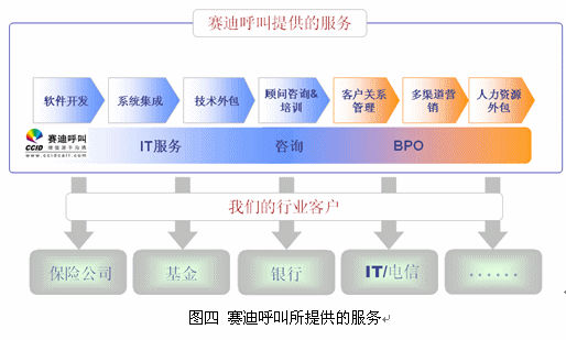 同時,賽迪呼叫所推薦給企業(yè)的并非只是軟件,而是結(jié)合了賽迪呼叫豐富的運營服務(wù)經(jīng)驗、技術(shù)服務(wù)能力的全方位信息化服務(wù)。賽迪呼叫的這種全面的信息化服務(wù),涵蓋IT服務(wù)、咨詢服務(wù)、BPO等,圖四給出了相應(yīng)展示。