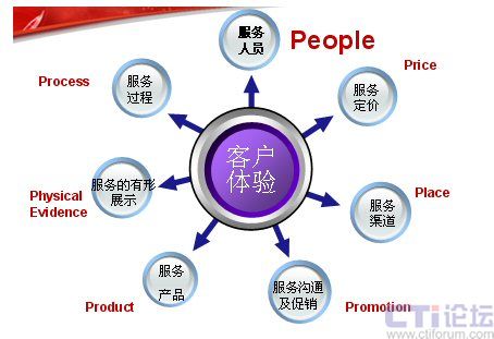 下面這張圖是服務(wù)營(yíng)銷的7P模型,在這里我認(rèn)為最應(yīng)該關(guān)注的是People——人。這里,我想引用世界經(jīng)理人刊登的一篇文章“影響中國(guó)的十大管理理念”上的一段文字:“邁向服務(wù)型經(jīng)濟(jì)實(shí)際上就是邁向人才經(jīng)濟(jì)。在制造業(yè)中,價(jià)值是由機(jī)器創(chuàng)造的。在服務(wù)業(yè)中,價(jià)值則是人創(chuàng)造的!边@也是在服務(wù)業(yè)中,要將“人”進(jìn)行體現(xiàn)。也許你不在乎為你制造產(chǎn)品的工人長(zhǎng)的美或丑,但為客戶服務(wù)的人員如果長(zhǎng)的很丑,對(duì)服務(wù)就會(huì)有一定的影響。大家只看產(chǎn)品結(jié)果,不關(guān)注過(guò)程,但是服務(wù)卻是與過(guò)程緊密的結(jié)合。