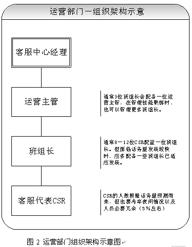 關(guān)于團(tuán)隊(duì)的建設(shè),應(yīng)該首先考慮組織架構(gòu)的設(shè)立。從運(yùn)營(yíng)角度講,設(shè)置客服中心經(jīng)理、運(yùn)營(yíng)主管、班組長(zhǎng)、客服代表都是必須的。當(dāng)然根據(jù)不同的規(guī)模,也可以增加或者減少層級(jí)。具體建議請(qǐng)見(jiàn)圖2所示。除了運(yùn)營(yíng)之外,對(duì)于大型呼叫中心(50坐席以上,或者業(yè)務(wù)較為復(fù)雜的),也應(yīng)考慮相關(guān)部門的設(shè)立。比如客戶關(guān)注組,可以負(fù)責(zé)疑難問(wèn)題解決、工單流轉(zhuǎn)、投訴處理、建議處理、知識(shí)庫(kù)建設(shè)采編等等;培訓(xùn)組可以負(fù)責(zé)管理、組織、實(shí)施員工培訓(xùn);技術(shù)維護(hù)組可以負(fù)責(zé)系統(tǒng)維護(hù)、網(wǎng)絡(luò)維護(hù)、新項(xiàng)目應(yīng)用界面開發(fā)、部分系統(tǒng)優(yōu)化;綜合行政可以負(fù)責(zé)人事、行政等事務(wù)。