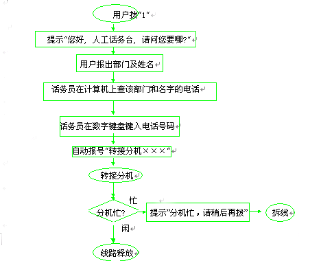 由于本系統(tǒng)除了具有自動接續(xù)功能外, 當用戶不知道分機號時可按部門名稱自動查號,這樣大部分的來話都可以實現(xiàn)自動接續(xù)。當少數(shù)來話需要人工查詢時, 人工輔助查號可以幫助話務員按部門的歸屬查找到所需電話, 系統(tǒng)自動報號及轉接, 話務員無需記電話號碼, 只需按幾下數(shù)字鍵, 其它一切均由電腦完成。系統(tǒng)的統(tǒng)計功能能統(tǒng)計出所有自動、人工的來話接續(xù)數(shù)據(jù), 按照電話頻率排列用戶的電話號碼, 便于話務員查找。