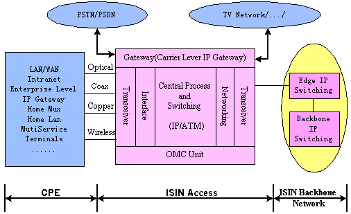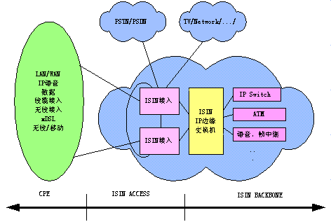 BACKBONE(骨干網)、ISIN ACCESS(接入網)和ISIN CPE(用戶端系統設備),可以構成向用戶提供語音、數據、圖像等綜合業(yè)務的統一的ISIN網絡體系。