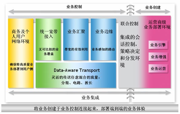 首先,我們提供了智能的、具備業(yè)務(wù)感知能力的、安全的融合網(wǎng)絡(luò):這意味著通過安全的網(wǎng)絡(luò)將正確的業(yè)務(wù)部署到正確的客戶端,并保證最高體驗質(zhì)量。它的本質(zhì)是在網(wǎng)絡(luò)的各個層面部署智能化和業(yè)務(wù)感知的元素,并實施完整的安全機(jī)制,正如我們前面提到的,業(yè)務(wù)演進(jìn)與網(wǎng)絡(luò)間相互有著緊密關(guān)聯(lián),為達(dá)到業(yè)務(wù)需求,網(wǎng)絡(luò)需要能夠根據(jù)業(yè)務(wù)進(jìn)行靈活調(diào)整。