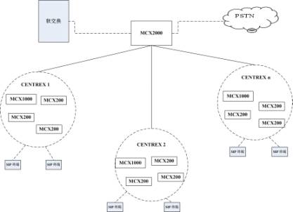 MCX2000支持連接多個(gè)屬于不同企業(yè)的MCX200/1000,能夠把同一個(gè)企業(yè)的不同MCX200/1000集中組成IP CENTREX群,支持群內(nèi)呼叫、群外呼入、群外呼出等功能,使用戶(hù)感覺(jué)不到多個(gè)MCX200的存在,如同所有的用戶(hù)在同一個(gè)交換設(shè)備內(nèi)。MCX2000同時(shí)支持多個(gè)IP