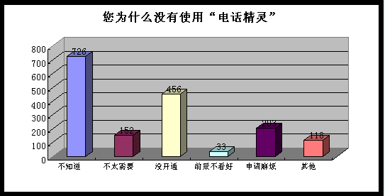 尚有相當(dāng)多地區(qū)沒(méi)有開(kāi)通此類服務(wù),用戶感到遺憾。在“您為什么沒(méi)有使用‘電話精靈’?”的統(tǒng)計(jì)結(jié)果中“當(dāng)?shù)貨](méi)有開(kāi)通”是一項(xiàng)主要原因,有不少用戶都留言希望能將電話精靈業(yè)務(wù)在更廣泛地區(qū)應(yīng)用。曾經(jīng)使用過(guò)“電話精靈”,但后期由于運(yùn)營(yíng)商停止了此項(xiàng)業(yè)務(wù)而不再使用的用戶也深感遺憾。