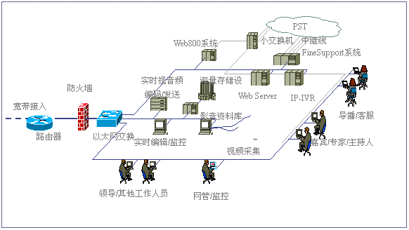 經(jīng)過(guò)對(duì)比分析,我們發(fā)現(xiàn),目前國(guó)際國(guó)內(nèi)市場(chǎng)上很多客戶(hù)服務(wù)產(chǎn)品,大都僅僅完成客戶(hù)服務(wù)的一部分。北極星“IP互動(dòng)客戶(hù)服務(wù)中心解決方案”則引入互動(dòng)客戶(hù)服務(wù)(ICS:Interactive Customer Service)系統(tǒng)以及數(shù)碼互動(dòng)直播的概念,形成了由視頻點(diǎn)播、網(wǎng)上路演、語(yǔ)音和文字交互、IP客戶(hù)服務(wù)中心、Web800語(yǔ)音電話(huà)、實(shí)時(shí)服務(wù)中心、專(zhuān)家實(shí)時(shí)在線(xiàn)、客戶(hù)關(guān)系管理、在線(xiàn)尋呼系統(tǒng)和客戶(hù)社區(qū)服務(wù)系統(tǒng)等全方位的服務(wù)內(nèi)容。該方案主要基于IP架構(gòu),系統(tǒng)擴(kuò)展性非常靈活,系統(tǒng)體現(xiàn)的客戶(hù)服務(wù)思想非常能夠滿(mǎn)足我們的需求。2001年3月,經(jīng)過(guò)一段時(shí)間的試運(yùn)行后,我們正式推出了這套“IP互動(dòng)客戶(hù)服務(wù)”系統(tǒng)。