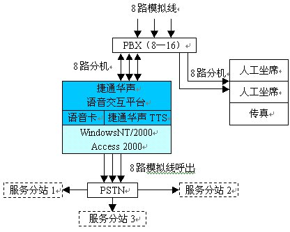 適用于中小型企事業(yè)單位的客戶服務(wù)系統(tǒng),或信息查詢系統(tǒng)。特點(diǎn)是線路資源主要用于交互系統(tǒng),可以最大限度的利用線路資源進(jìn)行服務(wù)或查詢工作。同時(shí)充分利用交換機(jī)進(jìn)行內(nèi)部線路交換,提高服務(wù)效率。