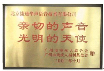 近日,廣州殘疾人聯(lián)合會(huì)授予了北京捷通華聲語(yǔ)音技術(shù)有限公司"親切的聲音,光明的天使"榮譽(yù)稱(chēng)號(hào),并頒發(fā)了金匾和榮譽(yù)證書(shū),感謝捷通華聲為廣州的社會(huì)福利事業(yè)的近10萬(wàn)元的捐獻(xiàn)與長(zhǎng)期的技術(shù)支持。