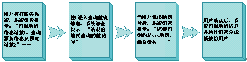 - 航班信息查詢是航空語音服務(wù)系統(tǒng)可加載的業(yè)務(wù)之一,還可以同時加載例如票務(wù)查詢與預(yù)定等業(yè)務(wù),在用戶通過語音預(yù)定后,可以選擇將票務(wù)信息通過短信或彩信發(fā)到手機(jī)上,從而實(shí)現(xiàn)電子訂票功能,減少了服務(wù)成本;