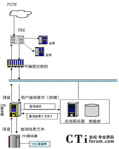 用戶可以通過電話提交他的查詢請求(比如使用按鍵方式,提交個人卡號等),IVR服務(wù)器收到請求后會向其他應(yīng)用服務(wù)器提交此查詢請求,當IVR得到查詢結(jié)果后,他會將文本形式的查詢結(jié)果交給jTTS服務(wù)器,jTTS服務(wù)器會返回查詢結(jié)果的語音形式,最終語音會在坐席上播放,用戶就可以聽到他剛才所要查詢的信息。