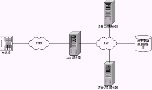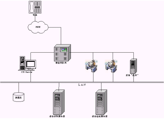 IVR模式是最常見的一種模式,這種模式也可以結(jié)合應用到前端以交換機接入的系統(tǒng)中去,在系統(tǒng)的IVR服務流程上,做出相應的修改,加入語音識別技術,同樣可以得到成功應用。另外一種模式暫且稱它為后備模式,該模式一個主要的特點是放在后端,比如在有座席接聽的情況下,采用語音識別技術的系統(tǒng)不被激活,也就是系統(tǒng)不給派線。當系統(tǒng)繁忙,而座席都占用的情況下,系統(tǒng)派線到采用語音識別技術的系統(tǒng),如同一個備用的座席。在這樣一個"座席"的軟件設計上,如同與人的交談一樣,系統(tǒng)也提出正常的詢問,但必須強調(diào)引導用戶來按照事先設定好的流程進行。這樣可以保證系統(tǒng)的接通率,特別是在一些對接通率和服務及時性要求比較高的場合采用,典型的代表如電信114查號臺和移動的1860客服中心,這些系統(tǒng)往往是隨著用戶急劇增加,撥打量也在穩(wěn)步上升,而呼叫響應要求及時。系統(tǒng)拓撲結(jié)構(gòu)如下圖示。