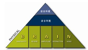 要達(dá)到清晰易懂的談話效果需要五個(gè)要素的配合:帶寬(Bandwidth)、回響(Reverberation)、振幅(Amplitude)、交互性(Interaction)、噪音水平(Noise)。任何一個(gè)會(huì)議系統(tǒng)的職責(zé)就是自動(dòng)調(diào)節(jié)和平衡這五個(gè)要素,使進(jìn)行交談的雙方都盡可能獲得最佳的聽(tīng)覺(jué)享受。在英文里,我們可以用每個(gè)單詞的首字母來(lái)記憶這五個(gè)特征,即:BRAIN模型。