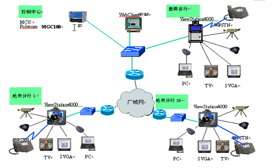 云南省中國(guó)銀行主會(huì)場(chǎng)放置1臺(tái)MGC-100 MCU和1臺(tái)視訊會(huì)議終端ViewStation4000,1套雙流模塊;其他16個(gè)地市各放置1臺(tái)視訊會(huì)議終端ViewStation4000,1套雙流模塊。MCU和視訊終端通過(guò)以太網(wǎng)交換機(jī)接入傳輸網(wǎng)絡(luò),根據(jù)各分地市網(wǎng)絡(luò)實(shí)際帶寬,視頻會(huì)議的帶寬定為2M。