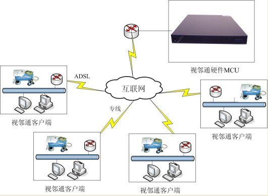 視鄰?fù)ㄏ到y(tǒng)采用軟硬結(jié)合的解決方案思想進(jìn)行設(shè)計(jì),主要組成是一個(gè)MCU,依據(jù)點(diǎn)數(shù)配備軟件終端,軟件終端含一個(gè)帶云臺可遠(yuǎn)程遙控的攝像頭,以及一個(gè)自帶回音消除的全向麥與小音箱。和傳統(tǒng)323產(chǎn)品比較,部署簡單,靈活,在互聯(lián)網(wǎng)表現(xiàn)效果良好,并具備強(qiáng)大的數(shù)據(jù)功能,同時(shí)價(jià)格更具競爭力,而純軟視頻會議系統(tǒng)相比,則在穩(wěn)定性,清晰度上更勝一籌。