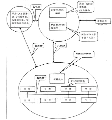 系統(tǒng)采用總部集中模式,前臺運行信雅達通訊轉接程序(CCPTOBMS)和信雅達業(yè)務處理程序(BMS)。通訊轉接程序從華為接入平臺接收各類業(yè)務請求,再轉發(fā)至業(yè)務處理程序。業(yè)務處理程序與新利處理中心通訊,將各類業(yè)務請求分類處理。后臺數(shù)據(jù)庫選用兩臺服務器安裝SQLSERVER7.0,使用OCTOPUS進行數(shù)據(jù)備份。
