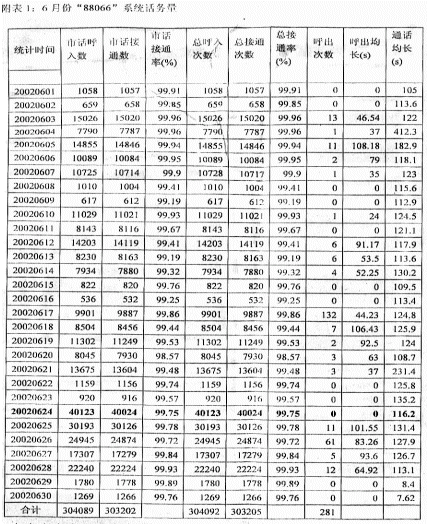 系統(tǒng)在2002年6月份的系統(tǒng)話務量情況見附表1。