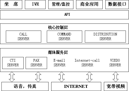 核心控制層由Call Server(呼叫控制) 、Command Server(命令服務(wù))、Distribution Server(路由服務(wù)) 組成。Call Server用于管理呼叫信息,維護(hù)整個(gè)系統(tǒng)呼叫的狀態(tài)機(jī);Command Server負(fù)責(zé)命令的接收和轉(zhuǎn)發(fā);Distribution Server完成路由功能。