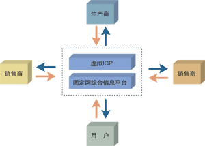 讓我們看看這樣一個應用,以固定網(wǎng)綜合信息平臺為基本支撐平臺,以“虛擬ICP”為業(yè)務(wù)承載平臺,包含了銷售商、生產(chǎn)商、供應商、消費用戶,形成了一個初步完整供應鏈系統(tǒng),如圖所示。