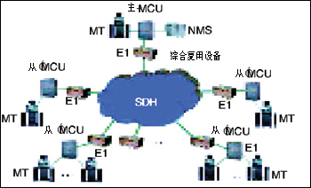 多點(diǎn)視頻會議系統(tǒng)主要由視聽多媒體會議終端MT、通信傳輸網(wǎng)絡(luò)SDH、網(wǎng)絡(luò)節(jié)點(diǎn)的多點(diǎn)控制單元MCU、網(wǎng)絡(luò)管理系統(tǒng)NMS以及外圍設(shè)備等幾部分組成。由于通信網(wǎng)絡(luò)不同,會議電視系統(tǒng)的終端和多點(diǎn)控制單元MCU也不盡相同。例如,對于采用電路交換通信網(wǎng)絡(luò)的多點(diǎn)會議系統(tǒng)通過MCU實現(xiàn),而包交換通信網(wǎng)絡(luò)則通過多點(diǎn)會議服務(wù)器來實現(xiàn)多方會議。如圖: